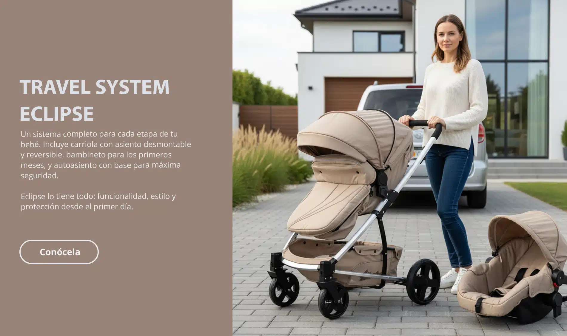 Nuestra carriola mas completa cuenta con bambineto y auto asiento es muy ligera por su estructura de aluminio y sus grandes llantas traseras la vuelven ideal para pasear en todo terreno.