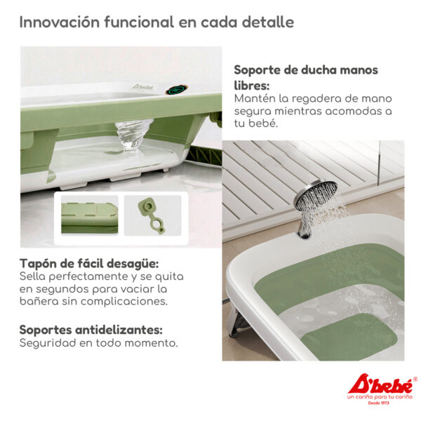 - Higiene y Comodidad: Cuenta con tapón de desagüe de fácil apertura y soporte para regadera, para que tengas las manos libres para consentir a tu bebé.